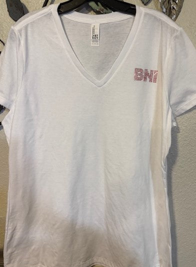 District brand, v-neck 4.3 oz 60/40 rung spun cotton/polyester Black or White with Red rhinestone BNI logo